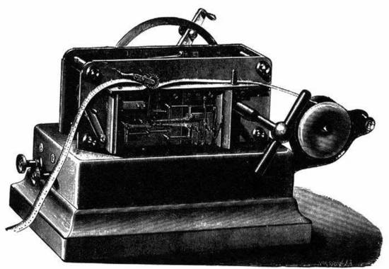 惠斯通自动发送机。事先打好孔的纸带从机器穿过,将消息以摩尔斯电码的形式高速传送出去