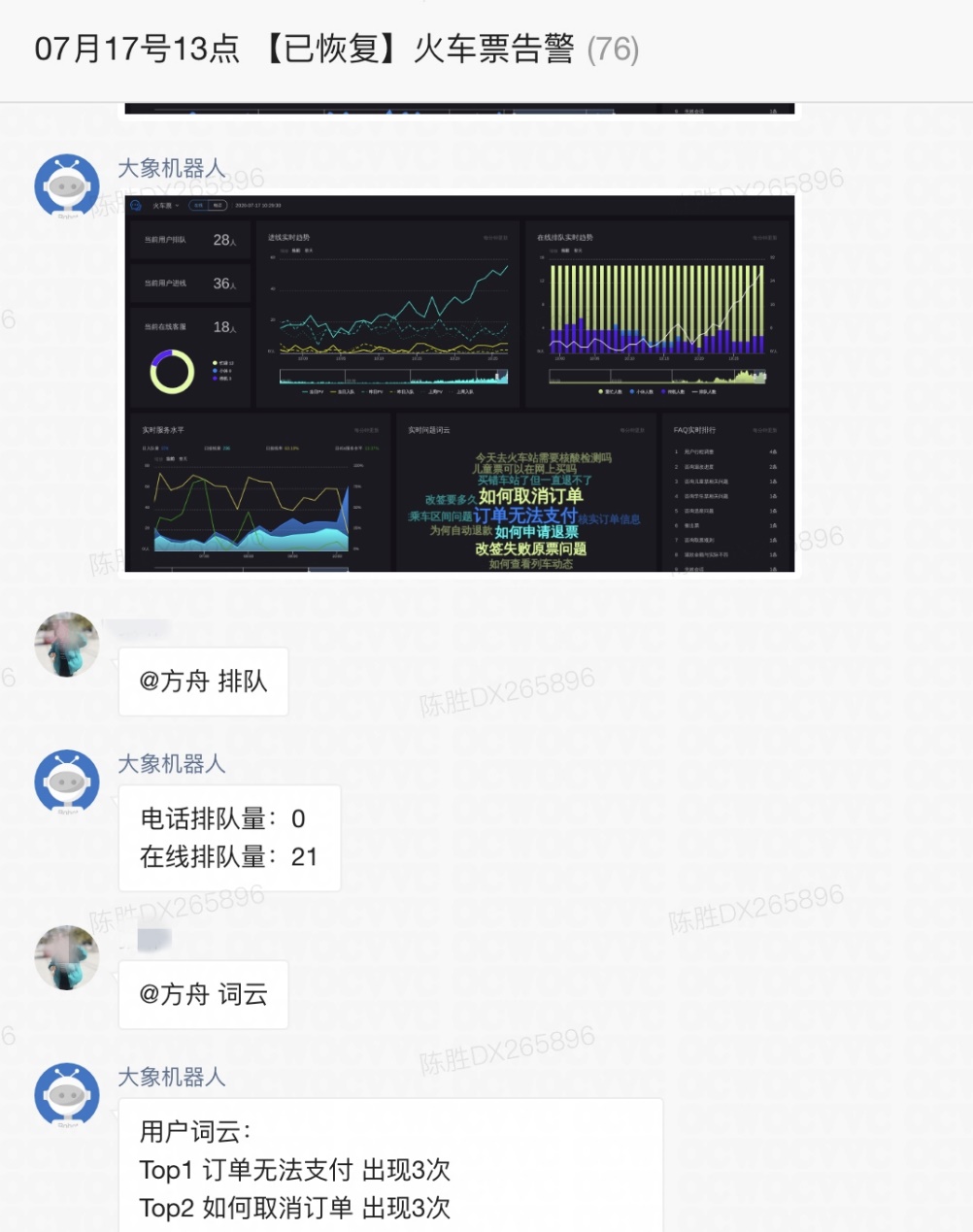这一块主要是需要两个能力,第一个是主动监控的能力,第二个是主动构建沟通环境的能力。主动监控需要监控每一条业务线目前的排队或者服务水平的情况,系统负责采集每分钟的排队或者服务水平数据,然后根据事先设定的分级阈值进行匹配,一旦超过阈值,就进行响应级别的告警,并且在告警之后还需要做持续的监控,一旦发现峰值级别有上升或者缓解,也及时地对峰值级别进行相应的调整。主动构建沟通环境主要是在系统发出峰值告警之后,根据事先配置的通知人员,组建一个沟通群,并且在群里同步当前峰值的最新情况,数据一般会包含峰值的级别,当前的进线和接线客服数据等,如图2所示。
