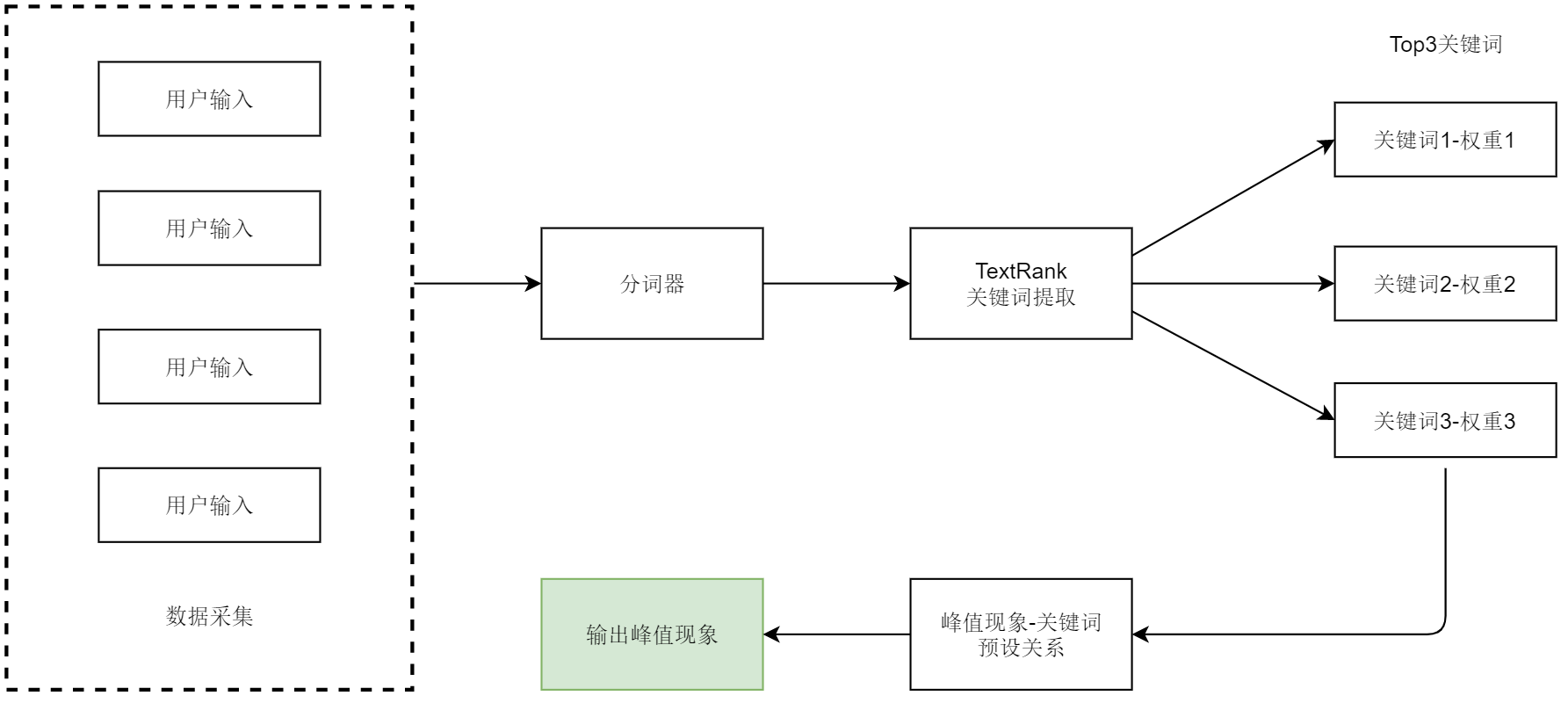用户与在线座席沟通过程中会通过文字来表达自己意图,用户意图可能需要多句话来表达,且表达方式多样,因此通过用户输入关键词集合表示峰值现象,具体实现流程见图3。系统通过采集在线客服系统最近10分钟(经验值)的用户输入,经过分词器,并过滤掉StopWord,经过textRank算法进行关键词提取,获取TOP3关键词和相应的权重,通过之前预设好的峰值现象和关键词的映射关系,来输出最终的峰值现象。