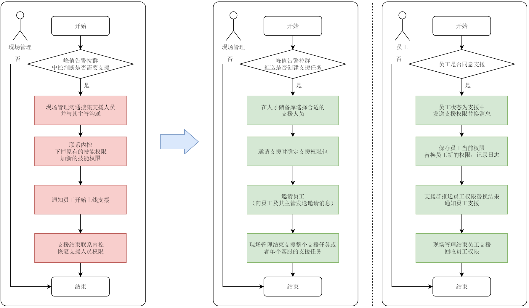 原有的支援流程都是线下沟通、效率较低,新的支援流程中员工的筛选、邀请、确认支援、替换权限、回收权限等流程都是系统自动化处理,支援员工可以快速上线,支援上线时间能够缩短到5分钟。