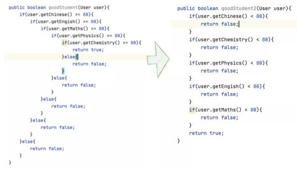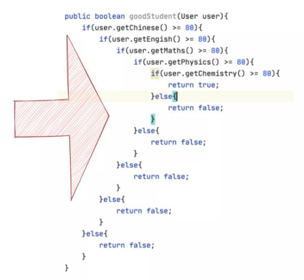 如果是业务允许其实是可以将多个判断条件进行整合,这样可以避免箭头形代码的出现。