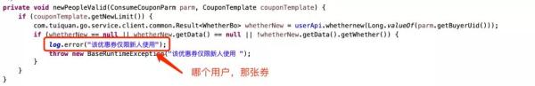 像以下的这个例子,打印了一个 log.error 日志,但这个错误,就算我们事后去查看日志,只知道这里有一个错误日志,但究竟是哪一个用户日志,哪一张优惠券的日志,无从得知,不能有助于我们直接定位错误。
