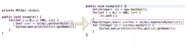 与项目内编程不同的是,每个 RPC 接口的调用都会伴随着一次的网络开销,需要需要对一个接口进行反复请求,这个时候可以要求 RPC 接口的提供方另外提供一个可以批量的接口,将单次反复的请求变成一次请求,减少网络开销。