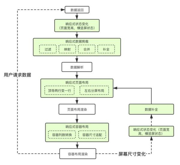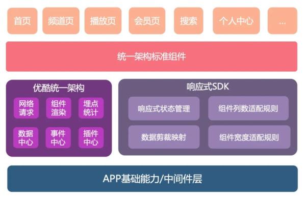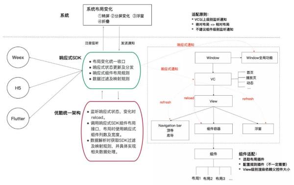 优酷响应式业务流程两端一致,响应式布局需要进行数据处理、响应式状态管理、触发布局等工作,优酷响应式SDK会在接口返回后处理相关数据,为统一架构提供相应布局接口,监控屏幕尺寸变化并触发布局等。