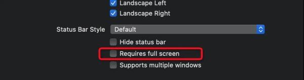 (3)注意不能勾选Requires full screen配置项或配置UIRequiresFullScreen为YES,如此会声明App要求全屏运行,自然表示不支持浮窗或分屏: