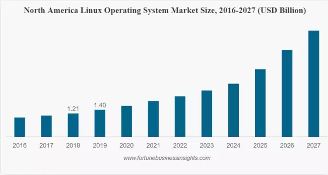 《Fortune Business Insights》的一份报告表明,2019 年全球 Linux 操作系统的市场规模为 38.9 亿美元;预计到 2027 年,Linux 市场规模将达到 156.4 亿美元,在预测期内复合年增长率为 19.2%。