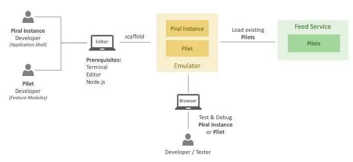 Piral 所要求的前提条件相当宽松,开发人员仅需要安装喜欢的编辑器、终端、网络浏览器和 Node.js 即可。开发者可以在本地开发机的仿真器中执行和调试 Piral instance(应用程序外壳)和 piltes(功能模块)。