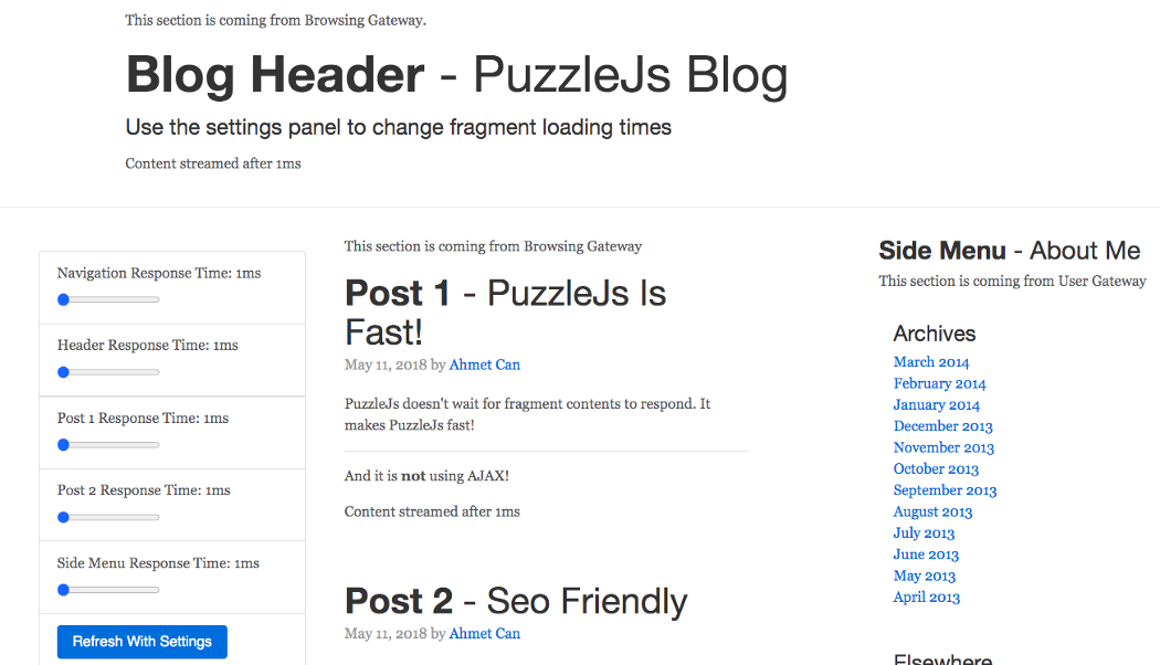 PuzzleJs 提供诸如创建网关或店面(彼此独立)的功能,并提供配置文件将它们连接。你可以使用它在编译时将 html 模板编译为 javascript 函数。此操作完全独立于请求,因此 PuzzleJ 可以使用此功能发送第一个块。它也是 SEO 友好的,在服务端进行准备和渲染。而且,当片段所需的 api 出现故障时,PuzzleJs 可保证其他页面片段仍正常工作。这里是一个真实的 例子。