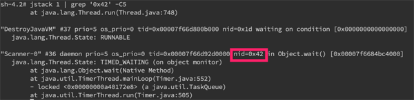 接着直接在 jstack 中找到相应的堆栈信息 jstack pid |grep 'nid' -C5 –color:
