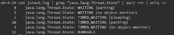 我们可以使用命令 cat jstack.log | grep "java.lang.Thread.State" | sort -nr | uniq -c 来对 jstack 的状态有一个整体的把握,如果 WAITING 之类的特别多,那么多半是有问题啦。
