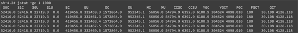 使用 jstat -gc pid 1000 命令来对 GC 分代变化情况进行观察,1000 表示采样间隔(ms),S0C/S1C、S0U/S1U、EC/EU、OC/OU、MC/MU 分别代表两个 Survivor 区、Eden 区、老年代、元数据区的容量和使用量。
