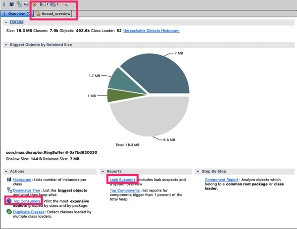另外也可以选择 Top Consumers 来查看最大对象报告。和线程相关的问题可以选择 thread overview 进行分析。