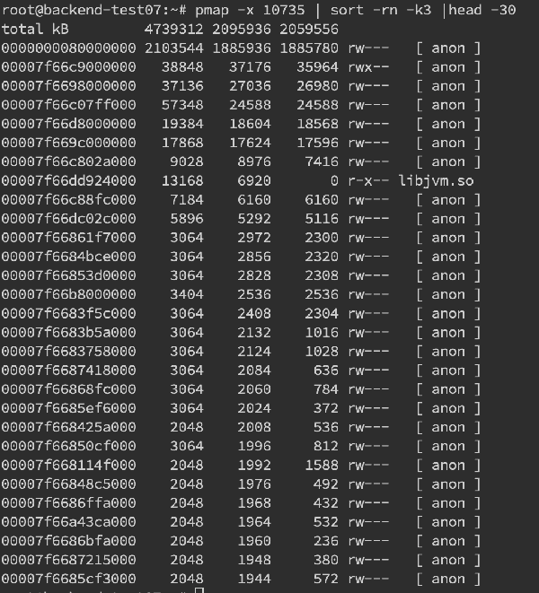 堆外内存溢出往往是和 NIO 的使用相关,一般我们先通过 pmap 来查看下进程占用的内存情况 pmap -x pid | sort -rn -k3 | head -30,这段意思是查看对应 pid 倒序前 30 大的内存段。