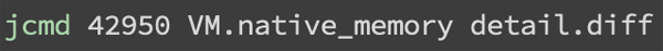 然后等放一段时间后再去看看内存增长的情况,通过 jcmd pid VM.native_memory detail.diff(summary.diff) 做一下 summary 或者 detail 级别的 diff。
