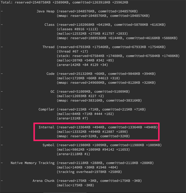 可以看到 jcmd 分析出来的内存十分详细,包括堆内、线程以及 GC(所以上述其他内存异常其实都可以用 nmt 来分析),这边堆外内存我们重点关注 Internal 的内存增长,如果增长十分明显的话那就是有问题了。
