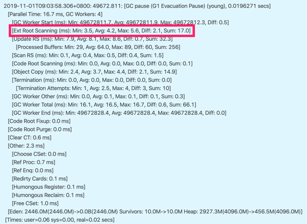 耗时过长问题就要看 GC 日志里耗时耗在哪一块了。以 G1 日志为例,可以关注 Root Scanning、Object Copy、Ref Proc 等阶段。
