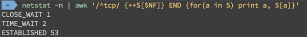 用 ss 命令会更快 ss -ant | awk '{++S[$1]} END {for(a in S) print a, S[a]}':