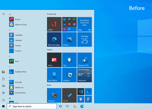 微软称:“我们正在以一种更简化的设计来更新‘开始’菜单,这种设计删除了应用程序列表中徽标后面的纯色背板,并为图块采用了均匀、部分透明的背景。