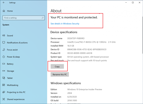 在20H2更新中,控制面板的System小程序中的所有信息都将迁移到“设置”>“系统”>“关于”下的“关于”设置页面。