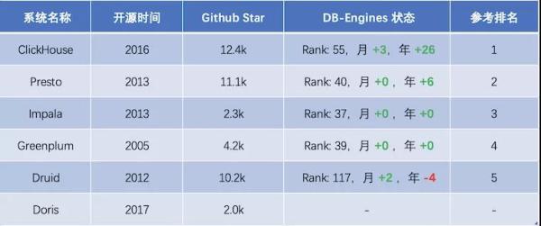 下面是 ClickHouse 及其他开源 OLAP 产品的发展趋势统计: