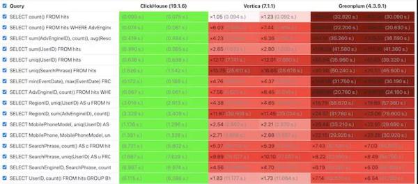 从测试结果看,ClickHouse 几乎在所有场景下性能都最佳,并且从所有查询整体看,ClickHouse 领先图灵奖得主 Michael Stonebraker 所创建的 Vertica 达 6 倍,领先 Greenplum 达到 18 倍。