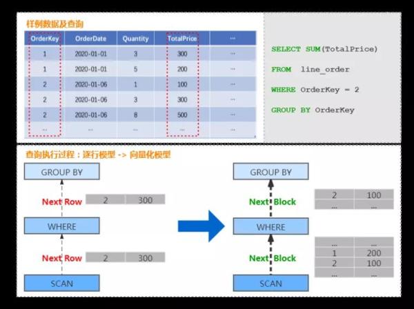 以商品订单数据为例,查询某个订单总价格的处理过程,由传统的按行遍历处理的过程,转换为按 Block 处理的过程。