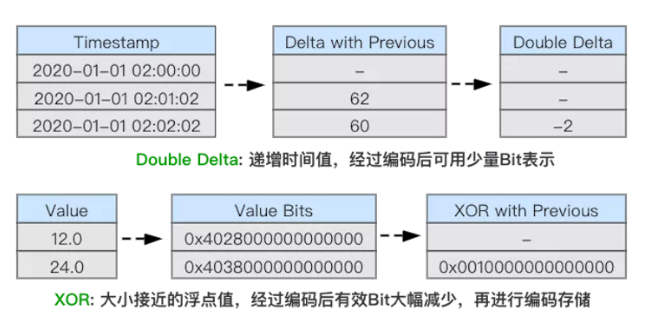 其中 DoubleDelta、Gorilla 是 Facebook 专为时间序数据而设计的编码算法,理论上在列存储环境下,可接近专用时序存储的压缩比,详细可参考 Gorilla 论文。