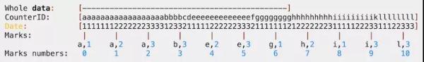 样例中的主键列为 CounterID、Date,这里按每 7 个值作为一个数据块,抽取生成了主键索引 Marks 部分。