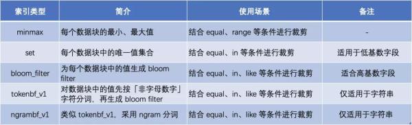 ClickHouse 支持更多其他的索引类型,不同索引用于不同场景下的查询裁剪,具体汇总如下,更详细的介绍参考 ClickHouse 官方文档: