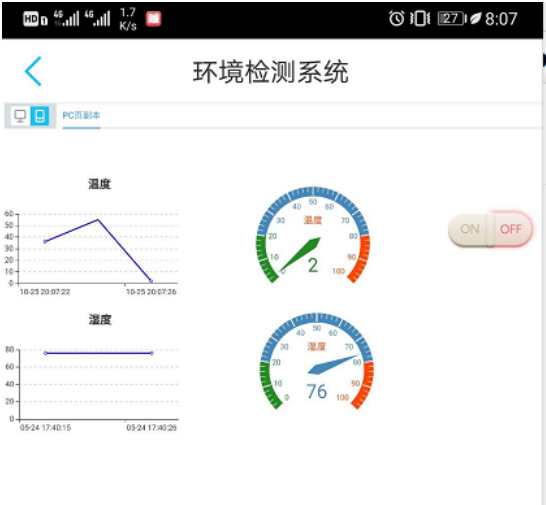 先看下效果,我这边使用的是OneNET物联云平台,进入应用,可以看到如下网页界面。该网页的温度、湿度数据由 鸿蒙开发板(Hi3861)上传,同时有一个开关按钮,可以控制开发板的LED灯。