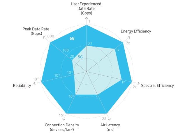 峰值数据速率1Tbps(1000Gbps),是5G的50倍