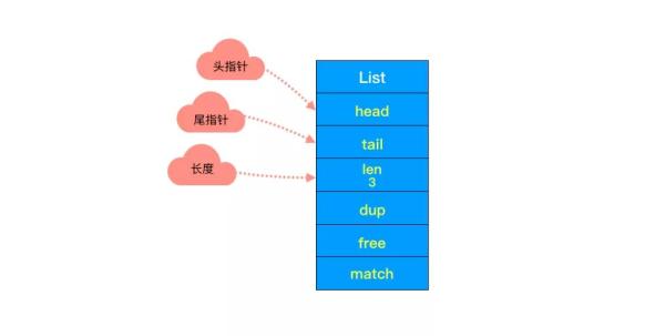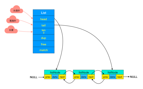 头节点里同时还有一个参数 len,和上边提到的 SDS 里类似,这里是用来记录链表长度的。