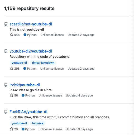 到现在为止,RIAA 的下架令明显起到了反效果,很多开发人员开始对此表示抗议,并发布了更多代码副本。目前 YouTube-dl 的在线副本数量已经达到历史新高,这场打击行动,反而成了 YouTube-dl 的一场宣传与狂欢。