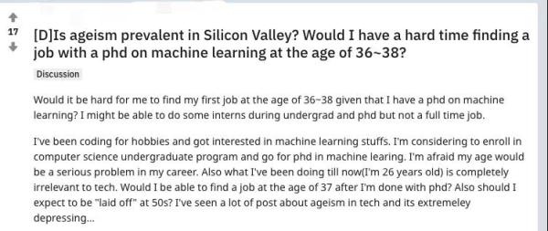 发帖人称:自己打算攻读机器学习博士学位,毕业时可能已经 36 岁,比较担心因年龄大而找不到工作,不知道硅谷存不存在年龄歧视?