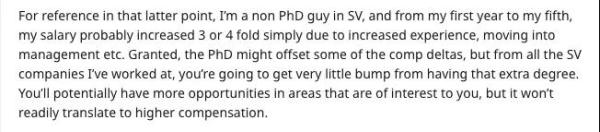 还有一些人认为,在科技公司,博士学位并不会带来更多额外的收入和报酬,与其读博不如早点进入公司工作,多积累一些经验会带来更为丰厚的回报。