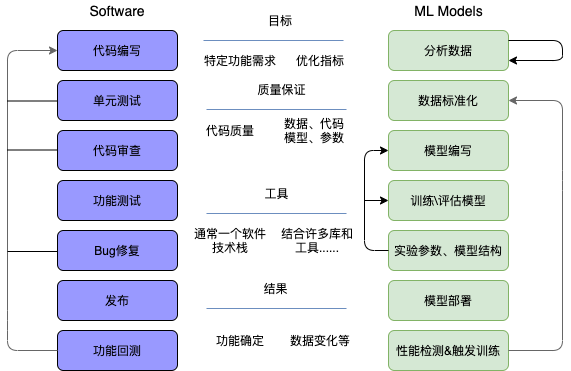 在传统软件开发中,我们需要对程序的行为进行硬编码,而在 NLP 机器学习模型开发中,我们将大量内容留给机器去学习数据,开发流程上有着本质的不同,如下图所示: