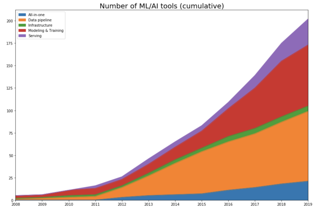 许多传统软件工程工具可用于开发和服务于机器学习任务,但是由于机器学习的特殊性,也往往需要自己的工具。比如:Git 通过逐行比较差异来进行版本控制,适用于大多数软件开发,但是不适合对数据集或模型检查点进行版本控制。在 2012 年随着深度学习的兴起,机器学习工具栈种类和数量爆炸式增长,包括 All-in-one(一站式机器学习平台):Polyaxon、MLFlow 等,Modeling&Training(模型开发、训练):PyTorch、Colab、JAX 等,Serving(发布、监控、A/B Test):Seldon、Datatron 等。下图表明 MLOps 每种类型的工具数目: