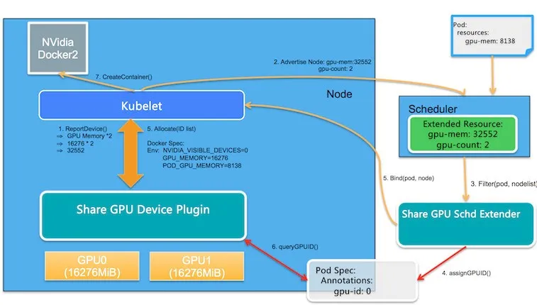 GPU Device Plugin 可以实现更好的隔离,确保每个应用程序的 GPU 使用率不受其他应用程序的影响。它非常适合深度学习模型训练场景,但是如果场景是模型开发和模型推断,会造成资源浪费。所以要允许用户表达共享资源的请求,并保证在计划级别不会超额订购 GPU。我们这里尝试 Aliyun 在 GPU Sharing 上的开源实现,如下图所示: