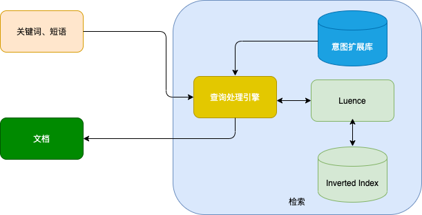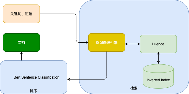 舆情中的搜索往往是词或短语,在缺少外部知识的情况下,搜索意图往往无法得知。在使用 Okapi BM25 传统的信息检索方式,只能得到查询关键词与文档相关,而并不符合搜索意图。在当时的架构下,主要是基于 Elasticsearch 的全文检索,以便考虑能否使用 ES 得出一个比较通用的处理框架。Elasticsearch 是基于 Luence 的架构。很多要素都是一脉相承的,例如文档和字段的概念、相关性的模型、各种模式的查询等。流程如下图所示: