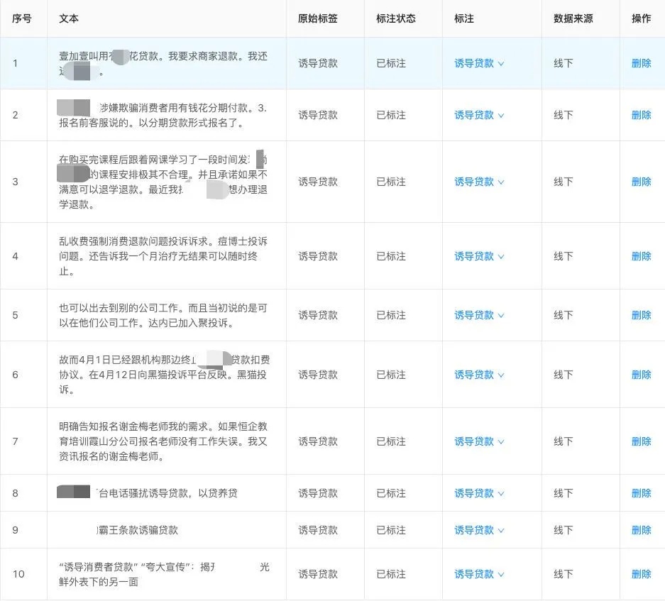 (3)标注数据 :按照规则定义进行数据标签处理。如果是一些分类标签,可以在线下直接标注;如果是一些实体标注、关系标注就需要对应一套在线标注工具进行高效处理。