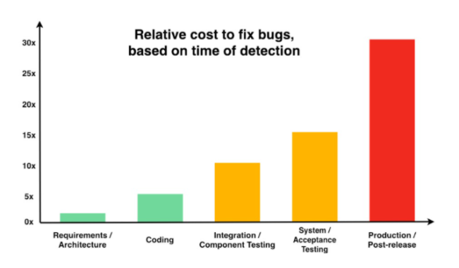 值得注意的是,错误的修复成本会在软件开发的各个阶段呈指数性增长(请参考:https://www.nist.gov/system/files/documents/director/planning/report02-3.pdf),并且会在产品发布的时候高达30倍以上。下图是此类费用随时间增加的统计图。