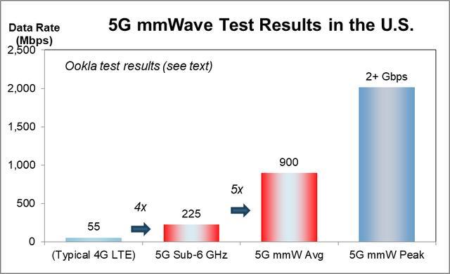 根据网络测速平台 Ookla 的实测数据,5G 毫米波终端下载速度是 6GHz 以下频段的 4 倍,平均速率达到 900 Mbps,峰值速率超过 2Gbps。
