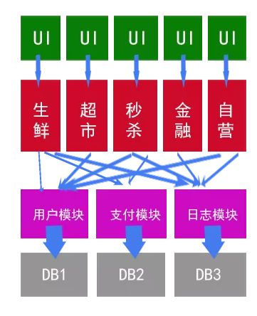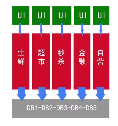 比如:有专门做商品秒杀的部门,有专门做生鲜商品的部门,有专门做超市的部门,等等,当然这是根据部门天生划分的,也有根据业务需求进行系统划分的。