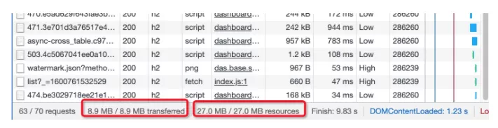 通过Chrome DevTools的Network标签,我们可以拿到页面实际拉取的资源大小(如下图):