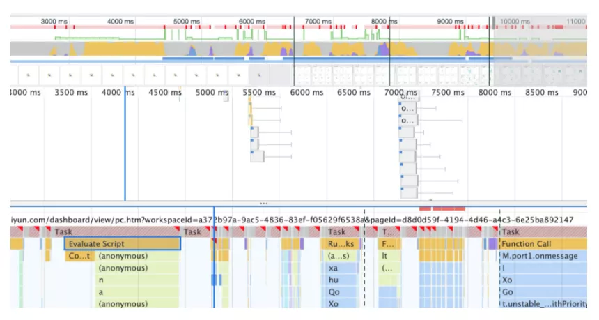 对于这些问题来源,通过Chrome DevTools的Performance火焰图,我们可以很清晰地了解整个页面加载和渲染流程各个环节的耗时和卡顿点(如下图):