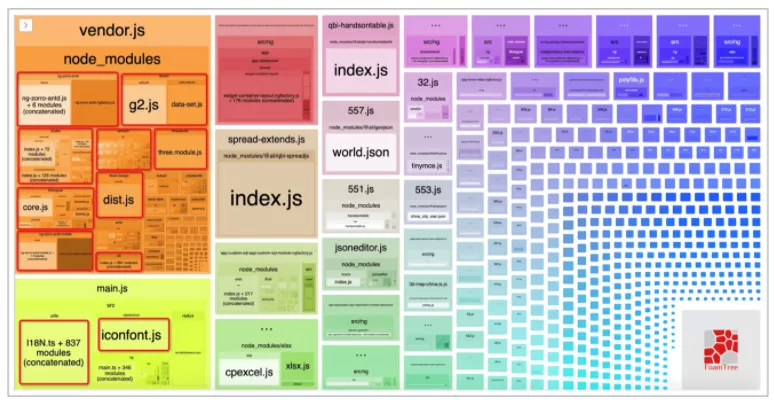 首先执行 webpack --profile --json > ./build/stats.json 得到 webpack的包依赖分析数据,接着使用 webpack-bundle-analyzer ./build/stats.json 即可在浏览器看到一张构建大图(不同项目产物不同,下图仅作举例):