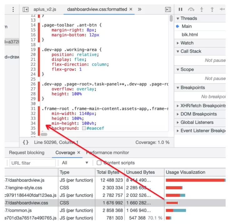 当然,还有一种直观的方式,可以采用Chrome的Coverage功能来辅助判定哪些代码被使用(如下图):