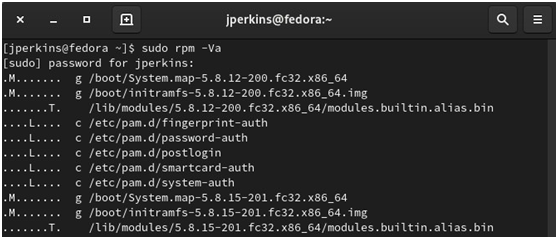 -V选项用于验证,这意味着它将检查安装文件方面的信息,并与rpm数据库中存储的信息进行比较。这一点帮助不大,因为它通常会给出一长串文件,但如果您遇到某个应用程序的问题,至少有地方可以入手。您可以对该列表中看到的任何可能带来麻烦的软件包运行dnf重新安装。