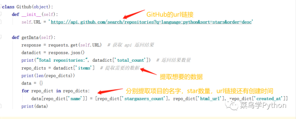 上述的程序中,利用requests库,就可以抓取API接口返回的json数据,并提取我们需要的项目内容。API返回的项目信息中,已经按照star的数量给我们做好了排序,所以我们只需要提取其中的项目名称、star数量、url链接已经创建时间即可。