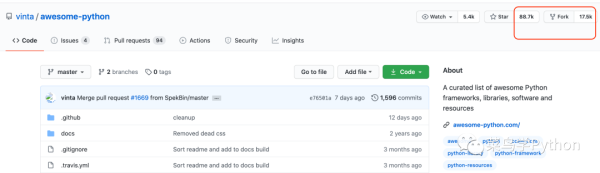 awesome-python(精选的python)从项目的名字就可以看出,它集合了大量的优质的python项目。而且覆盖范围很广,包含了Web框架、爬虫、数据可视化、图像处理、机器学习等等内容。堪称是python的资料大全。此外,该项目还有中文翻译版(https://github.com/jobbole/awesome-python-cn),大家也可以直接看中文翻译版,从中发现python项目宝库。